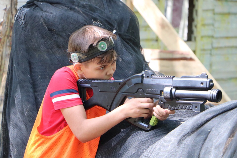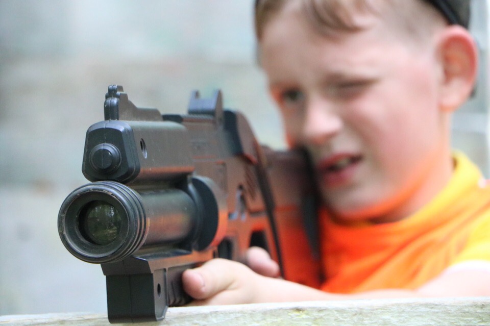 Полностью мультимедийное оружие последнего поколения, оборудованное коллиматорным прицелом. В игре нет физического контакта, на голове игрока установлены датчики, а на автомате лазер. При попадании лазером в датчик голос из колонки на автомате уведомляет Вас о ранении. Есть несколько сценариев игры, такие как захват флага, стенка на стенку и другие. На площадке присутсвует инструктор, который котролирует действия игроков.